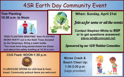 Earth Day Community Event: Happening on Sunday, April 21st. Please look at the attached flyer for details. Our habitat committee has organized this event.